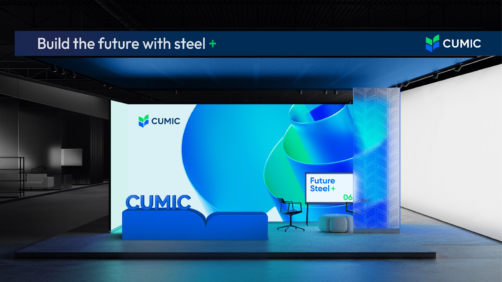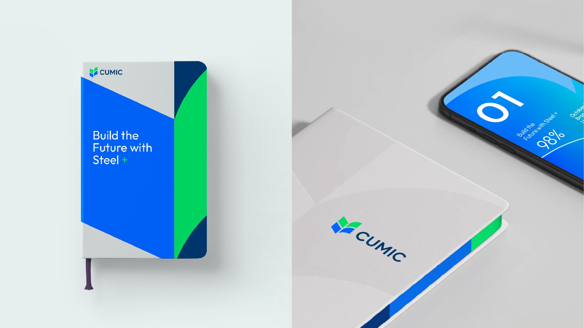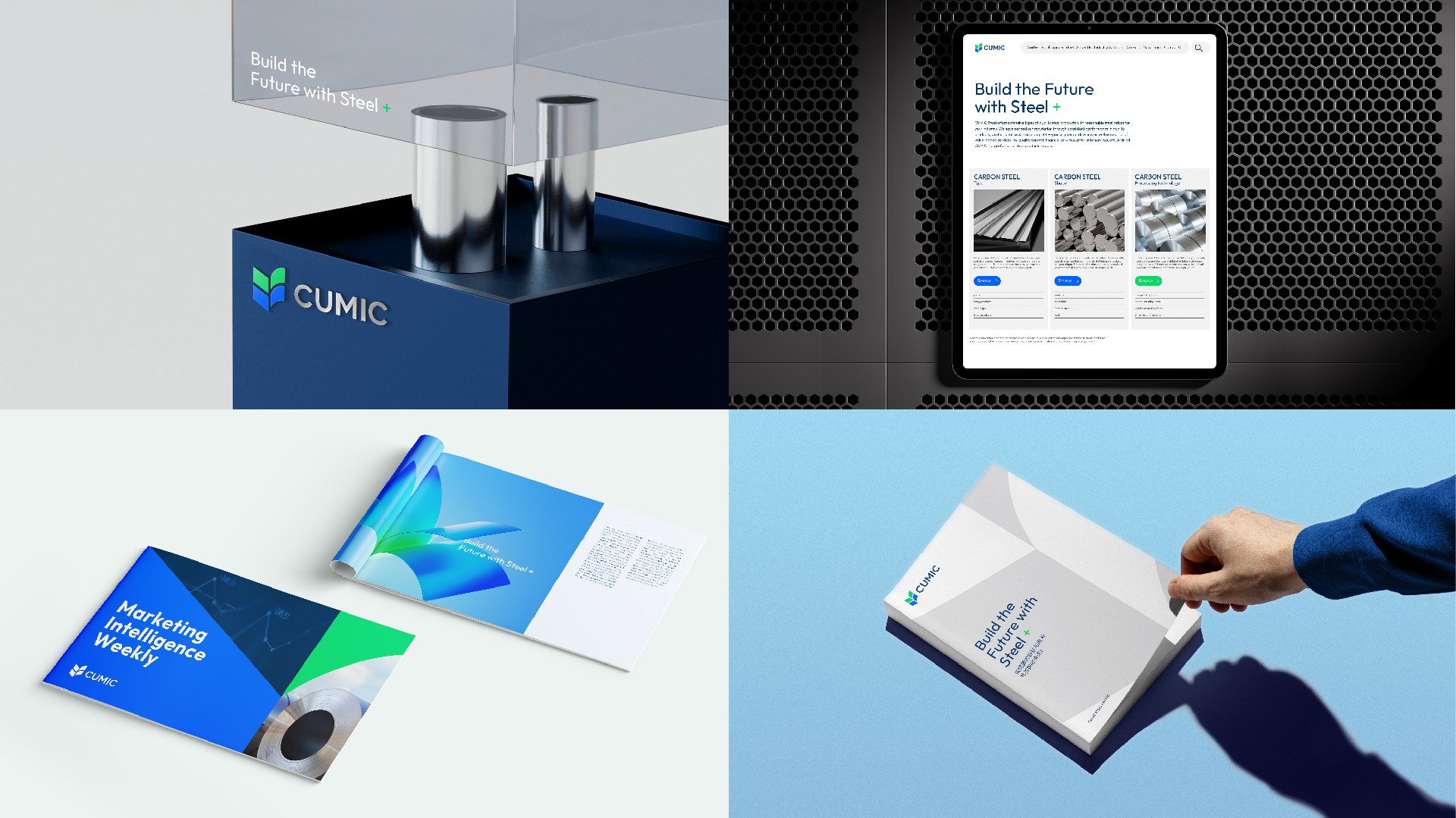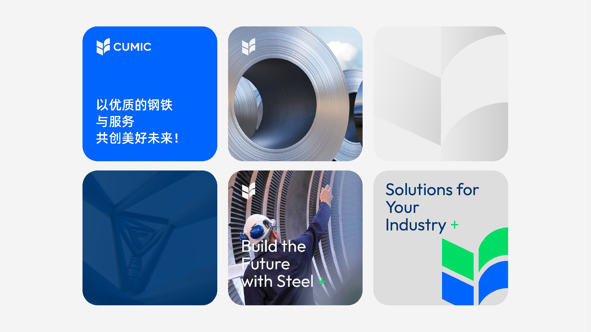 我們使用綠色和藍(lán)色,代表鋼鐵和生態(tài)的結(jié)合,用兩個“V”的疊加,持續(xù)訴說CUMIC的價值進(jìn)化,用四個圖形的匯聚鋼鐵服務(wù)供應(yīng)鏈